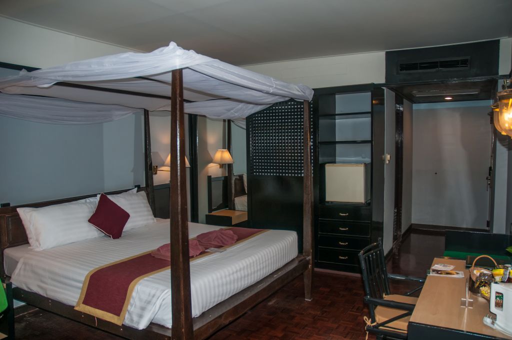Das "Hotel De´Moc" in Bangkok lag recht zentral und hatte 3 Sterne. Unser Zimmer 516 lag in der 5. Etage und war ausgestattet mit einem Balkon mit 2 Sitzgelegenheiten, und Blick auf eine Schnellstrasse und ein leerstehendes Hotel, einer funktionierenden Klimaanlage, die auch nach entfernen der Karte zum öffnen der Tür weiter lief, Parkettboden, einer gefüllten Minnibar, Himmelbett mit Moskitonetz, einem Schreibtisch, Flachbildschirm und einer Sitzcouch. In die Steckdosen passten EU Normstecker.