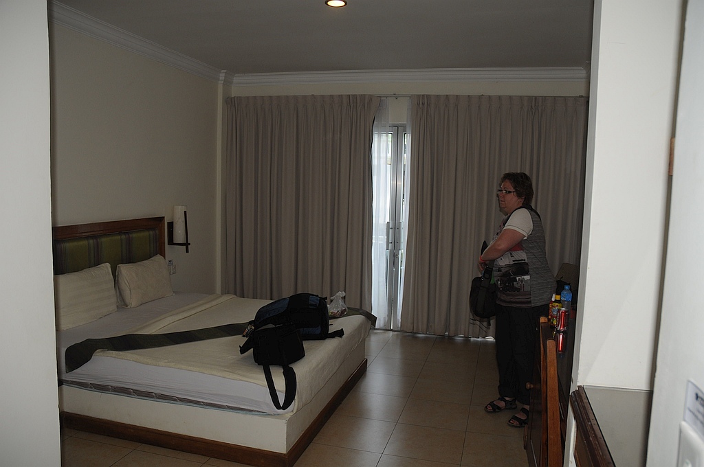 Unser Zimmer 204 war recht groß aber leider gab es keinen Balkon. Als Ausstattung gab es einen funktionstüchtigen aber leeren Kühlschrank, einen alten Röhrenfernseher, Einzelbetten, Fliesenboden und warmes Wasser in der Badewanne, in die auch das Abwasser der Kimaanlage hinen tropfte.