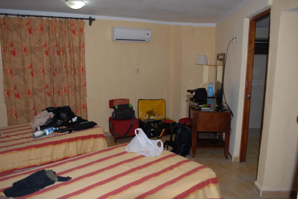 Die "Villa Tropico" in Jibacoa lag direkt am Sandstrand und hatte 3 Sterne. Es gab viele freistehende, kleine Wohneinheiten, doch wir hatten in einem mehrgeschossigen Haus ein Zimmer mit Balkon und Blick auf den Parkplatz. Es gab einen Fernseher mit deutscher Welle, Klimaanlage, Kühlschrank, einen Schreibtisch und ein Doppelbett. Was es mal wieder nicht gab, war ein Fahrstuhl.