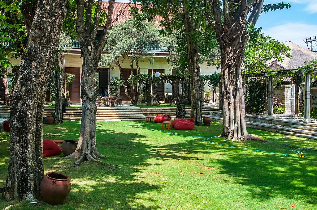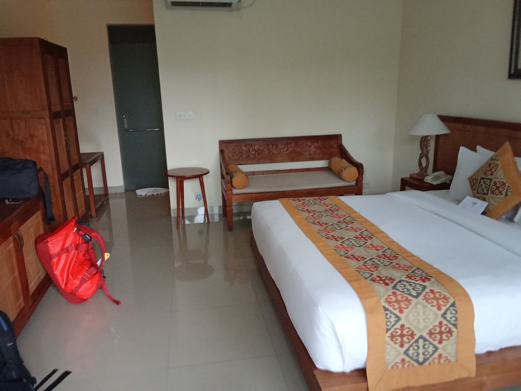 Das Sudamala Resort in Sanur (Bali) hatte 4 Sterne und lag in der zweiten Reihe des Strands. Die Anlage lag um zwei große Innenhöfe verteilt. In einem gab es einen Pool. Der andere war ein Garten mit Wiese und Sitzsäcken. Unser Zimmer im Erdgeschoss war wie eine Suite. Wir hatten einen eigenen Garten mit Terrasse und zweitem Eingang, Es gab einen Extraraum für die Koffer, ein Bad mit zwei getrennten Schiebetüren und einer offenen Dusche. Im Hauptraum war ein Ventilator unter der Decke und es gab eine Klimaanlage. Die Minibar war gefüllt und WLAN sowie TV waren auch vorhanden. Weiterhin gab es ein Doppelbett, Schreibtisch und eine Tür im balinesischen Stil (leider zu breit für Zuhause, ansonsten hätte ich sie geklaut).