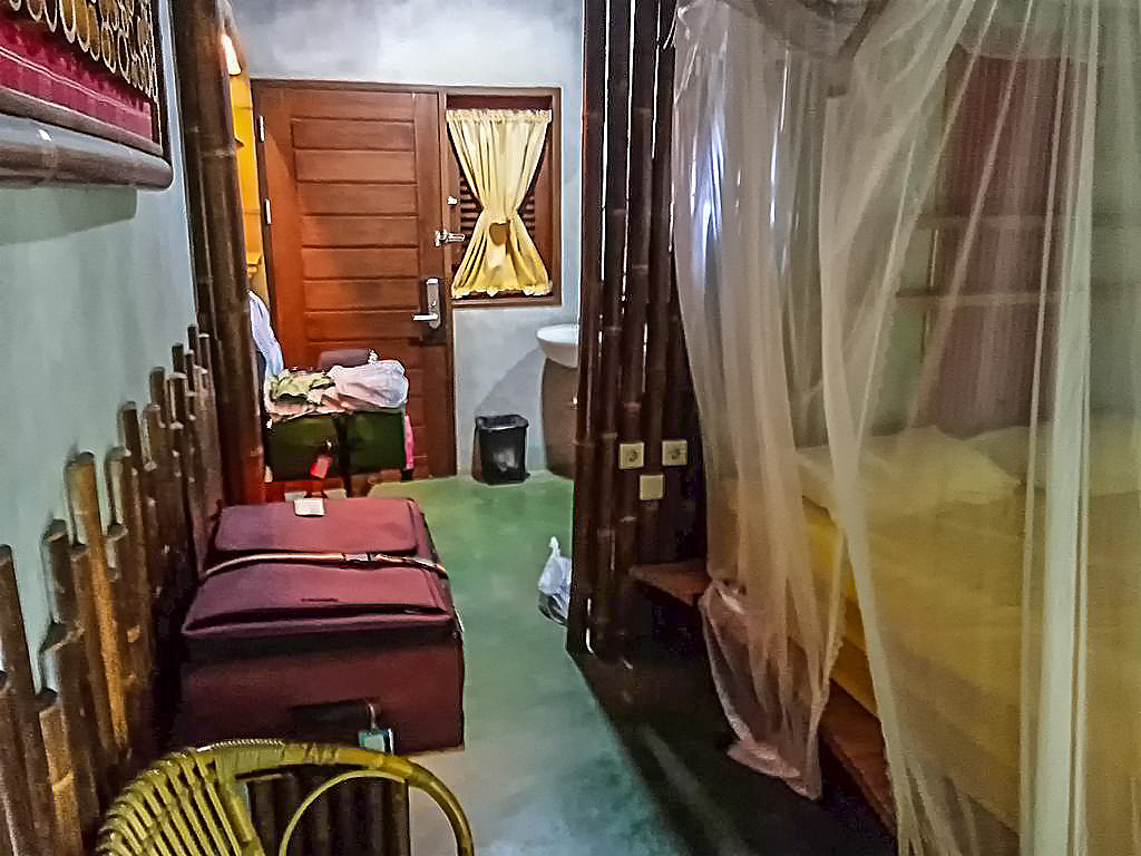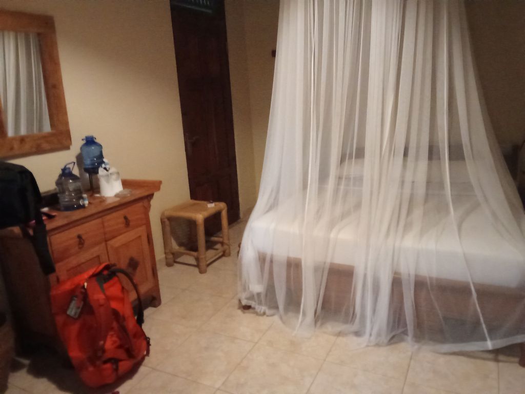 Die Hütte hatte zwei Etagen mit 2 Schlafzimmern und zwei Toiletten, Terrasse mit Garten, Balkon und im Hauptzimmer stand ein Doppelbett mit Mosquitonetz und es gab stabiles WLAN. Mehr war nicht. Keine Klimaanlage oder TV. In den Fenstern waren auch nur Fliegengitter und Fensterläden. Kein Glas. Der Boden im Bad und der Dusche bestand aus Kies. Für die Koffer hatten wir einen freien Raum, in dem keine Möbel, nur zwei große Plastikboxen standen.
