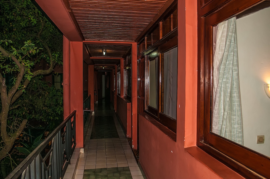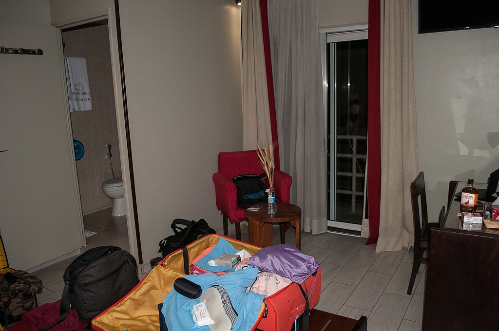 Das "Hotel Grand Mellis" in Antananarivo hatte 3 Sterne und war ein typisches Stadthotel für die erste Nacht einer Rundreise. Trotz des heruntergekommenen Äusseren war es eigentlich nicht mal übel, doch konnte man das Restaurant wegen Bauarbeiten nur über einen schmalen Gang am innen liegenden Pool vorbei erreichen. Das WLAN funktionierte (an der Rezeption) und auch der Fahrstuhl machte keine Probleme. Die Zimmertür ließ sich per Chipkarte öffnen.