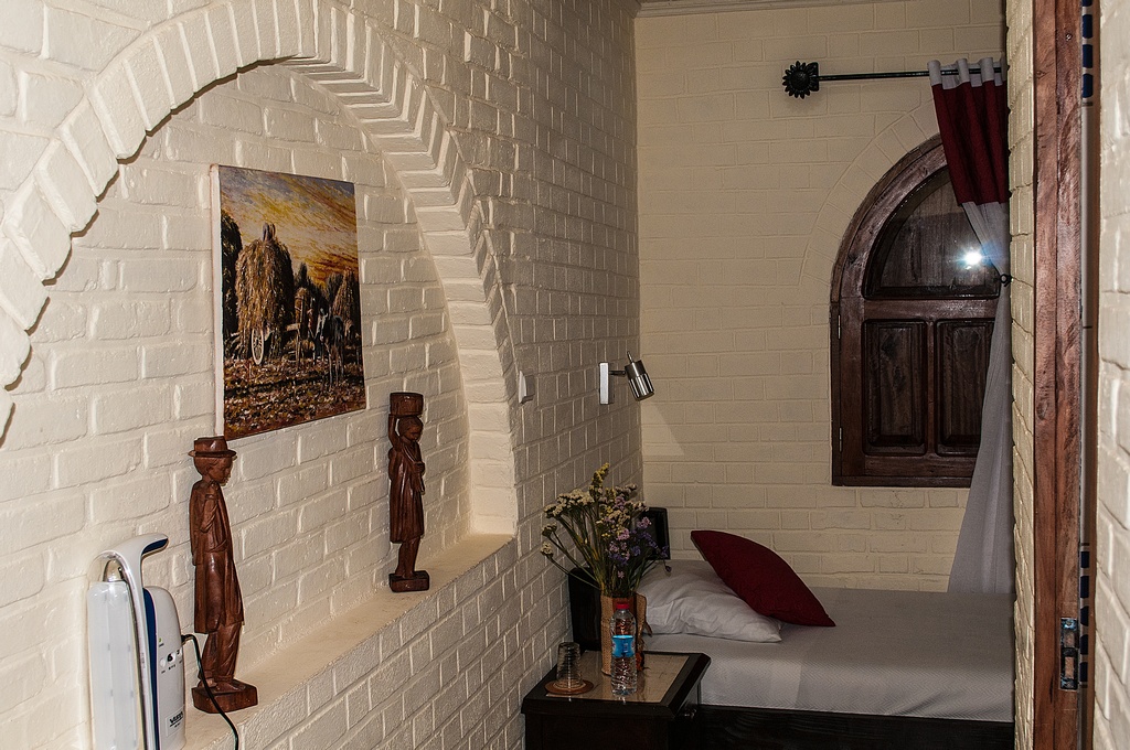 Die Eco-Lodge "Les Chambres du Voyageur" in Antsirabe lag mitten in einem traumhaften Garten. Die Zimmer hatten keine Nummern, sondern nur Namen. Unser "Ravinala" hatte zwei Wohneinheiten mit einem gemeinsamen Wohnzimmer, wo eine Couch und Sessel standen. Dort gab es auch einen Fernseher.