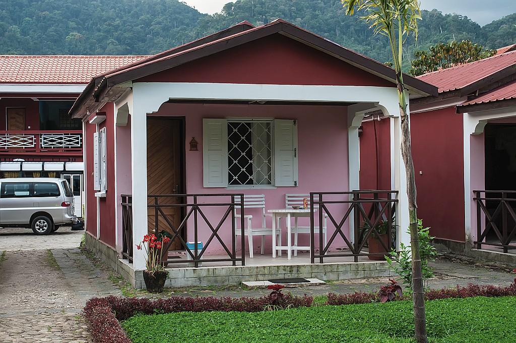 Hütte mit Veranda und 2 Sitzplätzen mit Blick in den Garten. Hinter dem Garten war ein Fluss mit einer Fussgängerbrücke. Im Fluss wurde die Wäsche des Hotels gewaschen. Auf der anderen Flusseite begannen die Berge mit dichtem Regenwald.