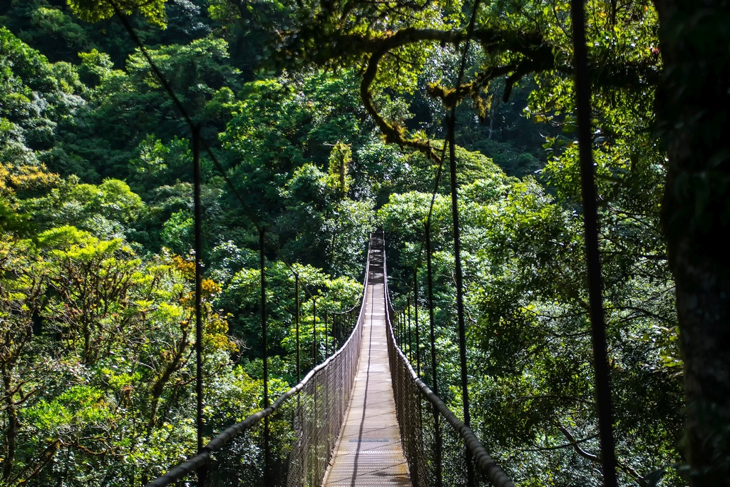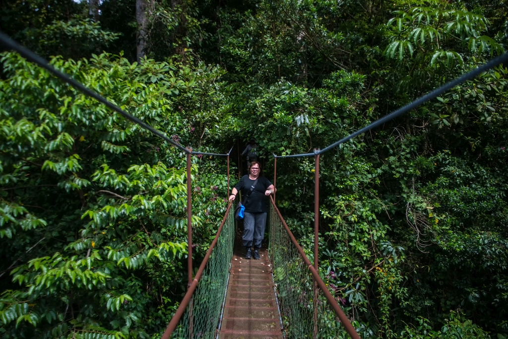 8:30 begann dann unsere Hängebrücken-Tour mit einer örtlichen Reiseleiterin. Über 6 verschiedene Hängebrücken sollte es heute gehen. Alle mussten noch unterschreiben, dass wir das Risiko auf eigene Kappe nehmen, und dann ging es los. Erst mal steil bergauf auf Pfaden durch den Nebelwald, der heute Vormittag zum Glück klar war.