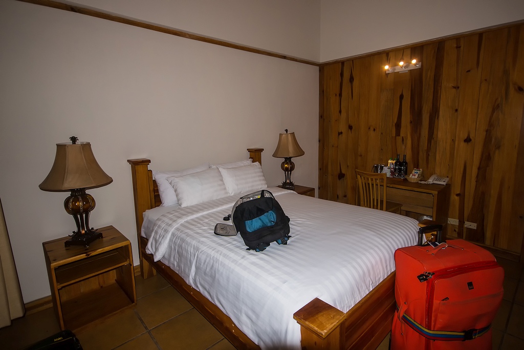 Das "Hotel Valle Verde" in El Valle de Antón hatte 3 Sterne. Die ganze Eco-Lodge lag in einem wunderschönen Garten in Mitten der Natur. Es gab draußen natürlich auch einen Pool. Restaurants waren innerhalb 15 Minuten zu Fuß erreichbar. Unser Zimmer lag im Erdgeschoss und hatte eine überdachte Terrasse mit Tisch und Stühlen. Das Zimmer mit Doppelbett war aber sehr klein, so das wir kaum Platz hatten, unsere Koffer hin zu legen. Es gab natürlich eine Klimaanlage, TV und kostenloses WLAN. Der Boden war gefliest. Dusche und Warmwasser funktionierten ebenfalls. Einen Fön gab es nicht.