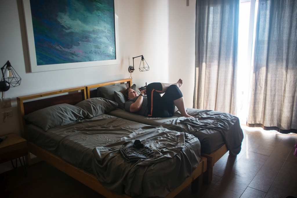 Auf dem sehr großen Balkon stand weder ein Tisch noch ein Stuhl. Und keiner der Stühle aus dem Zimmer passte durch die Balkontür. Also musste man am Boden sitzen.