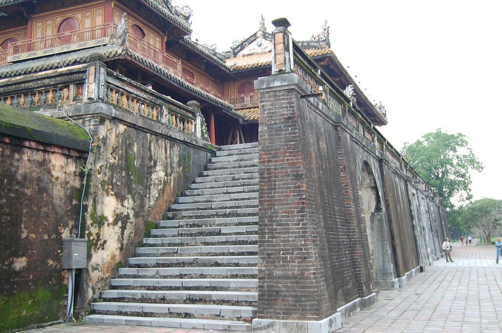 Anschliessend fuhren wir mit dem Reisebus, der dort bereits auf uns wartete, zum alten Kaiserpalast, erbaut nach dem Muster der "Verbotenen Stadt" in Peking. Der quadratische Grundriß der Zitadelle und der Kaiserstadt entspricht der chinesischen Herrschaftsideologie, wonach die Erde als Quadrat angesehen wurde und der Palast die Herrschaft des Kaisers auf Erden repräsentierte. Leider wurden Teile des Palastes der Vietnamesischen Kaiser im Vietnamkrieg von den Amerikanern zerbombt, da sie dort (mal wieder) ein Lager der Vietkong vermuteten. Seit 1995 gillt das Gelände wieder als Mienenfrei und man arbeitet an der Rekonstruktion der zerstörten Gebäude. 2003 wurde der Kaiserpalast in die Liste der Weltkulturerbe der UNESCO aufgenommen.